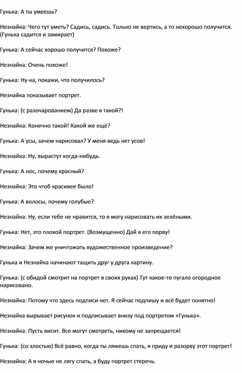 Тюбик уходит. Незнайка увлеченно рисует и раскладывает рисунки. В дверь выглядывает Гунька.