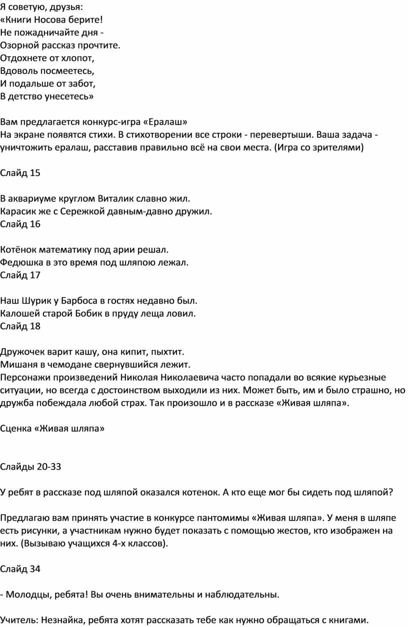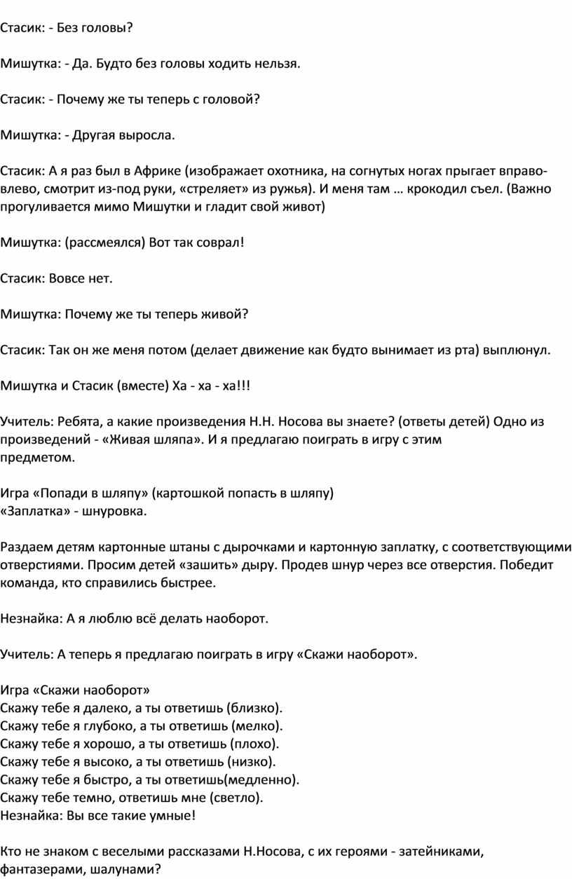 Учитель: Ребята, а какие произведения Н.Н. Носова вы знаете? (ответы детей) Одно из произведений - «Живая шляпа». И я предлагаю поиграть в игру с этим
