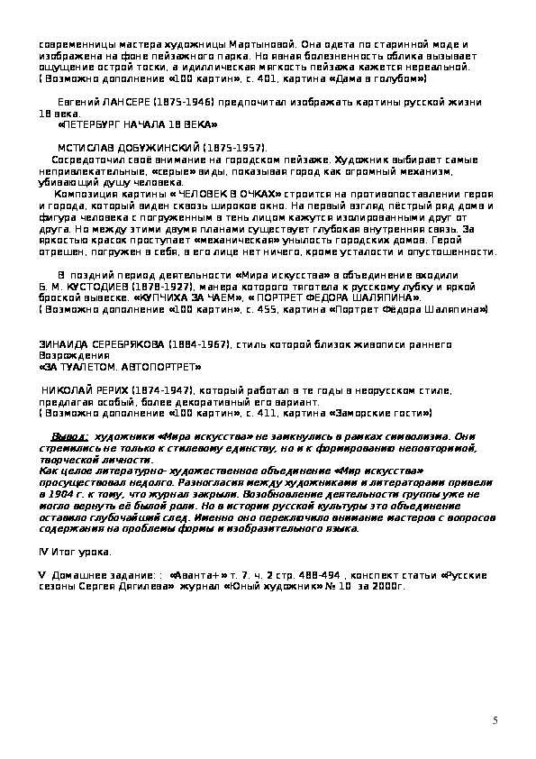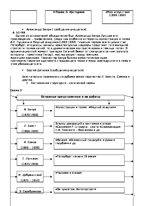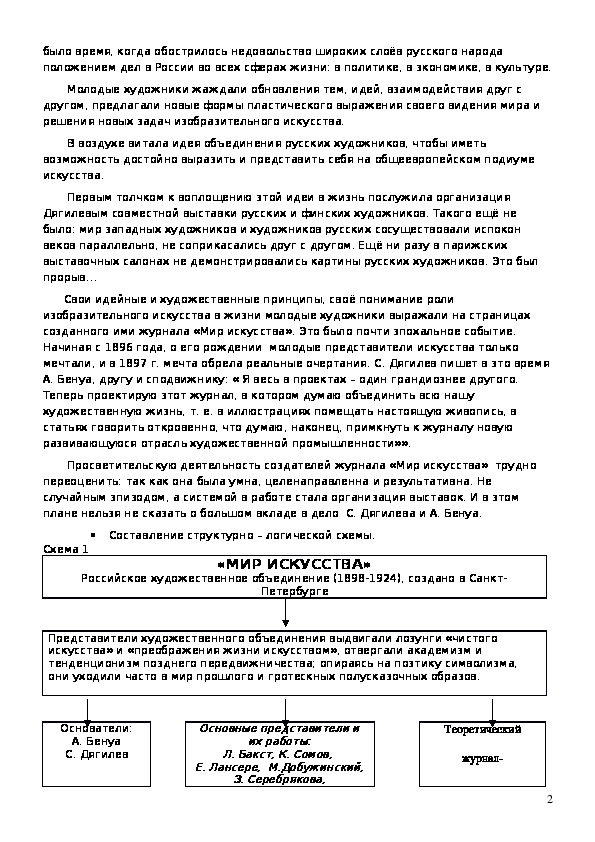 «Мир искусства», его рождении и просветительской роли; познакомить с