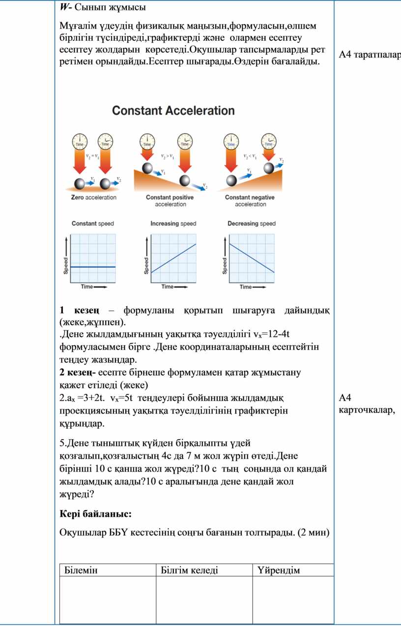 W- Сынып жұмысы Мұғалім үдеудің физикалық маңызын,формуласын,өлшем бірлігін түсіндіреді,графиктерді және олармен есептеу есептеу жолдарын көрсетеді.Оқушылар тапсырмаларды рет ретімен орындайды.Есептер шығарады.Өздерін бағалайды.