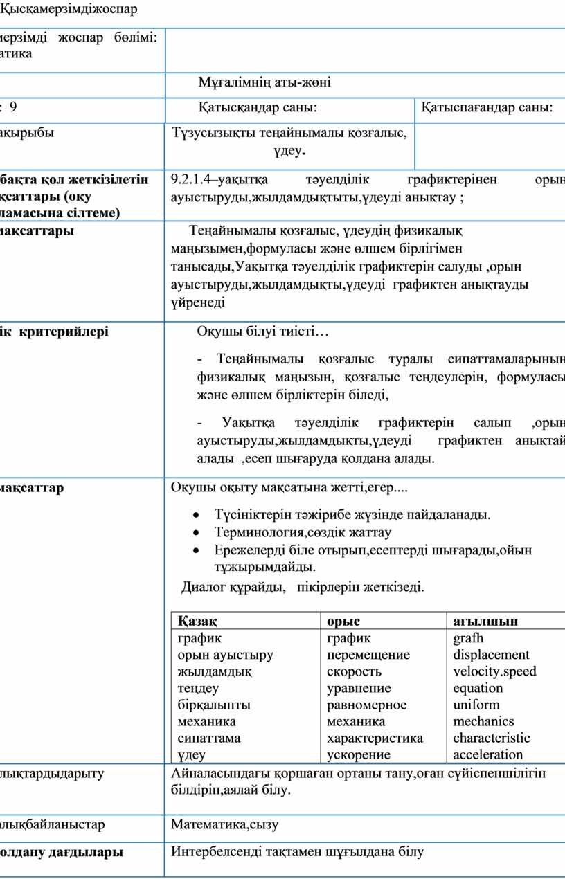 Теңайнымалы қозғалыс, үдеудің физикалық маңызымен,формуласы және өлшем бірлігімен танысады,Уақытқа тәуелділік графиктерін салуды ,орын ауыстыруды,жылдамдықты,үдеуді графиктен анықтауды үйренеді |