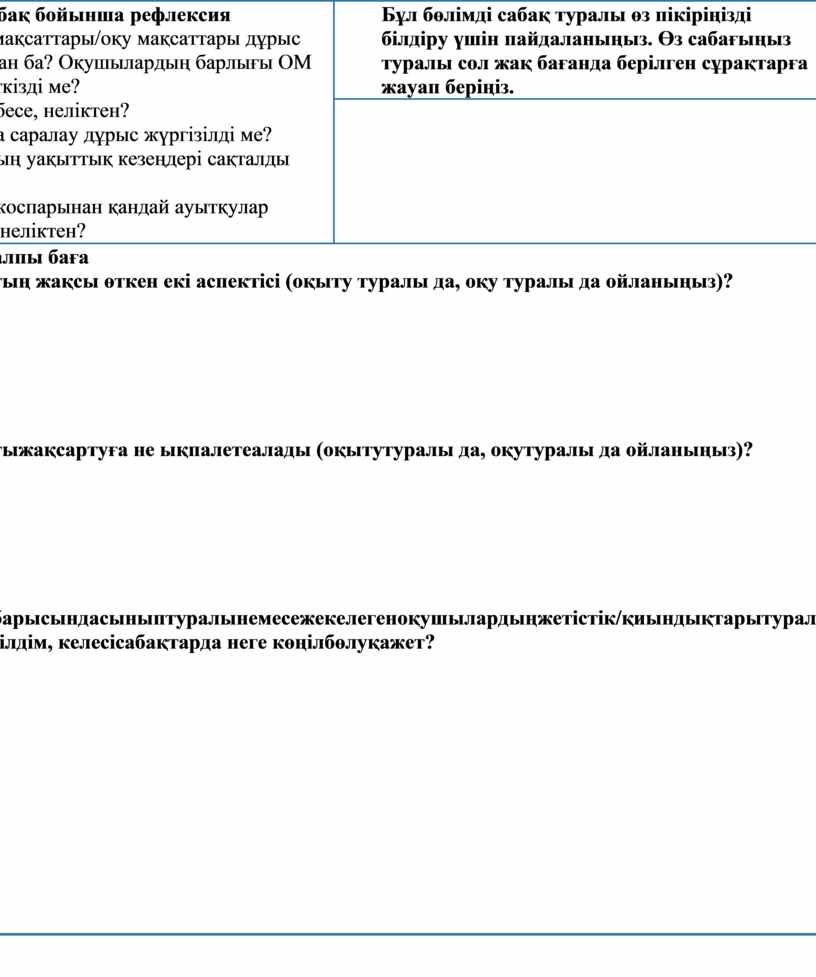 Сабақ бойынша рефлексия Сабақ мақсаттары/оқу мақсаттары дұрыс қойылған ба? Оқушылардың барлығы ОМ қол жеткізді ме? Жеткізбесе, неліктен? Сабақта саралау дұрыс жүргізілді ме? Сабақтың уақыттық кезеңдері сақталды ма? Сабақ жоспарынан қандай ауытқулар болды, неліктен? |