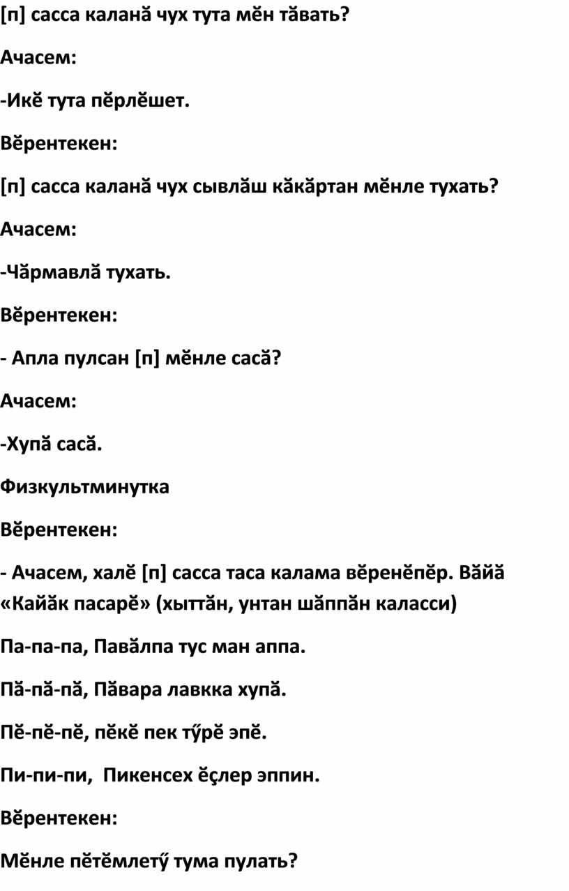 - Ачасем, эпир паян сирӗнпе [п] сасӑ ҫинчен вӗренӗпӗр, ӑна тӗрӗс калама, сас паллисемпе палӑртма, п сас паллиллӗ сӑмахсене тӗрӗс вулама вӗренӗпӗр.