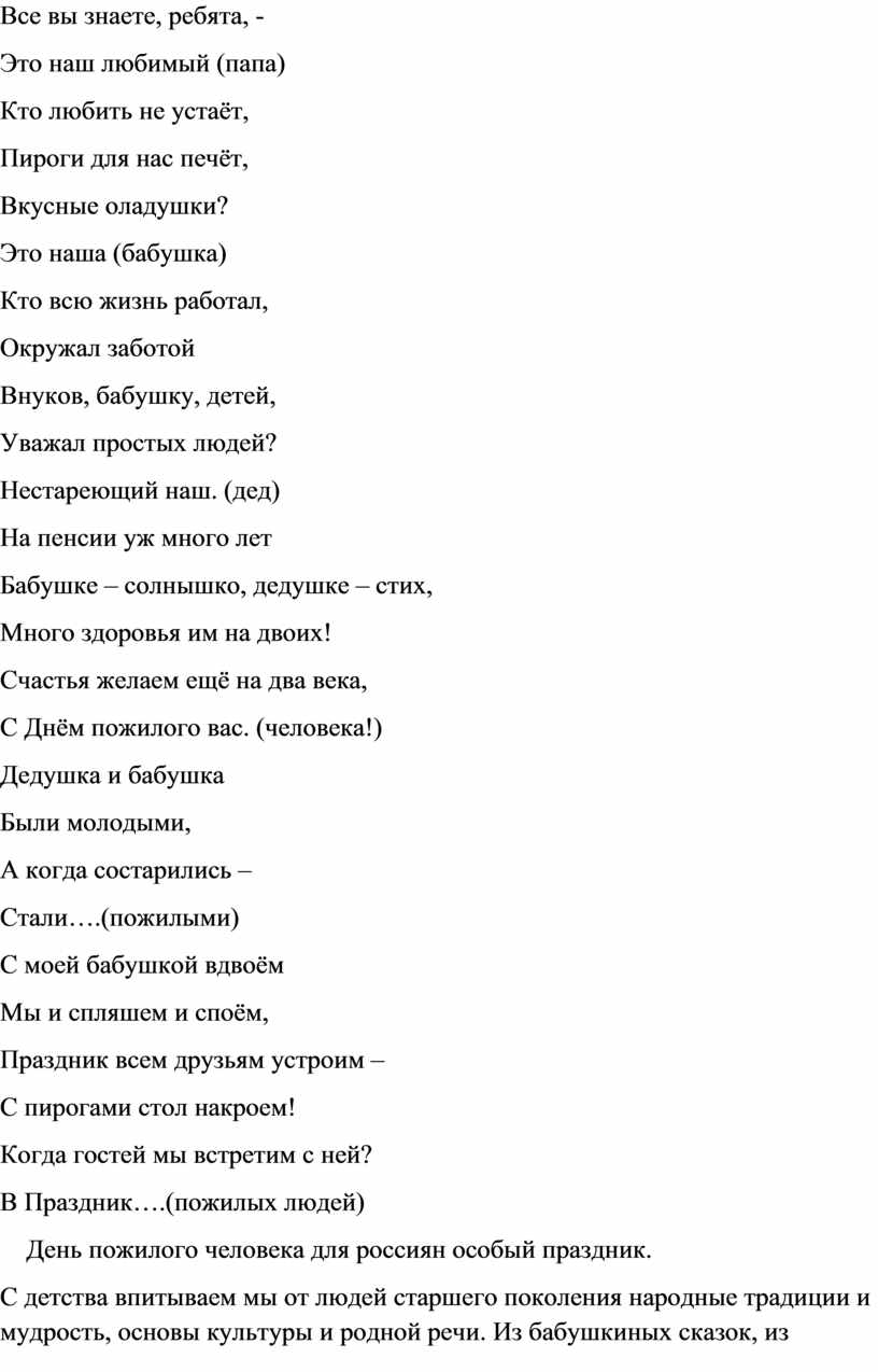 С детства впитываем мы от людей старшего поколения народные традиции и мудрость, основы культуры и родной речи. Из бабушкиных сказок, из рассказов деда рождается наша первая любовь к родной земле и её жителям. Никогда не забудем мы того, что сделано руками людей старшего поколения. Они возводили фабрики и заводы, воевали на фронтах, добросовестно трудились в мирное время, воспитывали нас, своих детей и внуков.