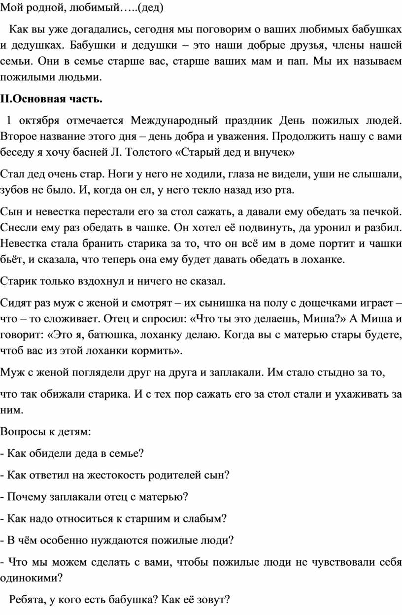 1 октября отмечается Международный праздник День пожилых людей. Второе название этого дня – день добра и уважения. Продолжить нашу с вами беседу я хочу басней Л. Толстого «Старый дед и внучек»