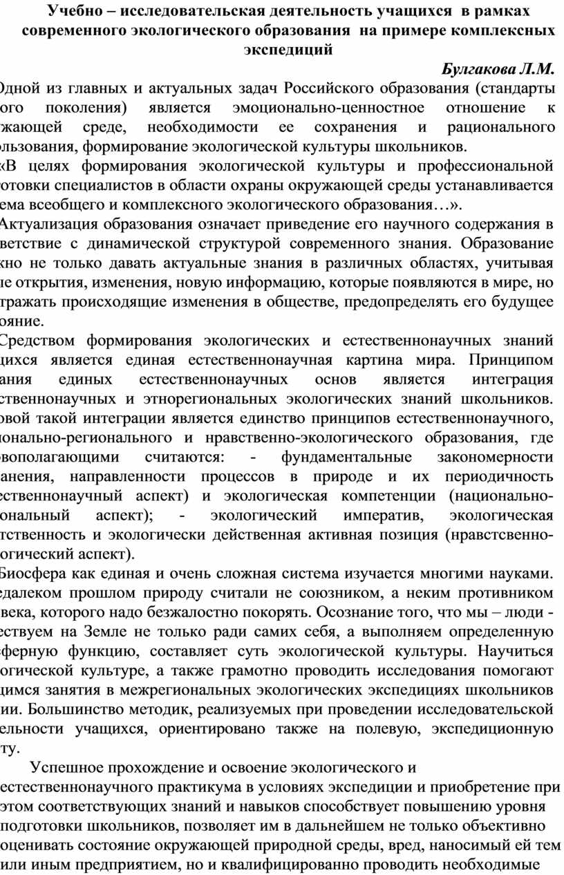 Учебно – исследовательская деятельность учащихся в рамках современного экологического образования на примере комплексных экспедиций