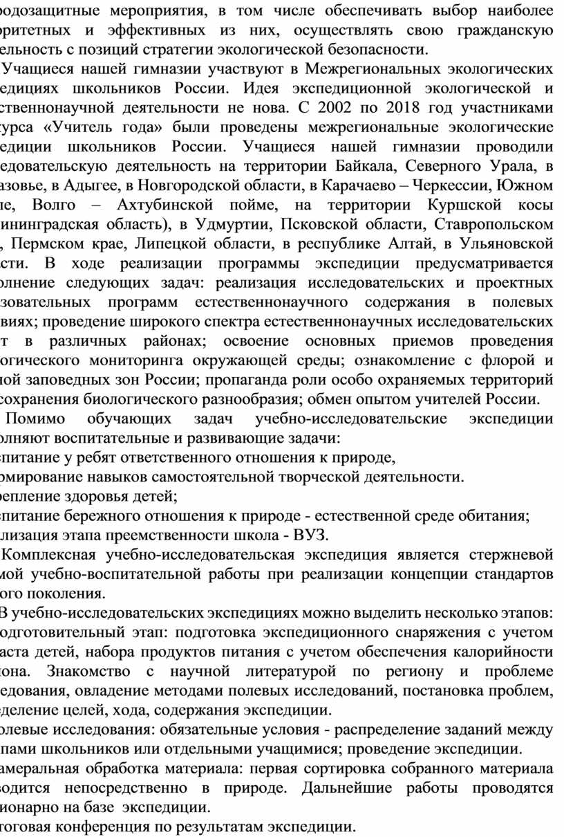 Учащиеся нашей гимназии участвуют в Межрегиональных экологических экспедициях школьников России. Идея экспедиционной экологической и естественнонаучной деятельности не нова. С 2002 по 2018 год участниками конкурса «Учитель года» были проведены межрегиональные экологические экспедиции школьников России. Учащиеся нашей гимназии проводили исследовательскую деятельность на территории Байкала, Северного Урала, в Приазовье, в Адыгее, в Новгородской области, в Карачаево – Черкессии, Южном Урале, Волго – Ахтубинской пойме, на территории Куршской косы (Калининградская область), в Удмуртии, Псковской области, Ставропольском крае, Пермском крае, Липецкой области, в республике Алтай, в Ульяновской области. В ходе реализации программы экспедиции предусматривается выполнение следующих задач: реализация исследовательских и проектных образовательных программ естественнонаучного содержания в полевых условиях; проведение широкого спектра естественнонаучных исследовательских работ в различных районах; освоение основных приемов проведения экологического мониторинга окружающей среды; ознакомление с флорой и фауной заповедных зон России; пропаганда роли особо охраняемых территорий для сохранения биологического разнообразия; обмен опытом учителей России.
