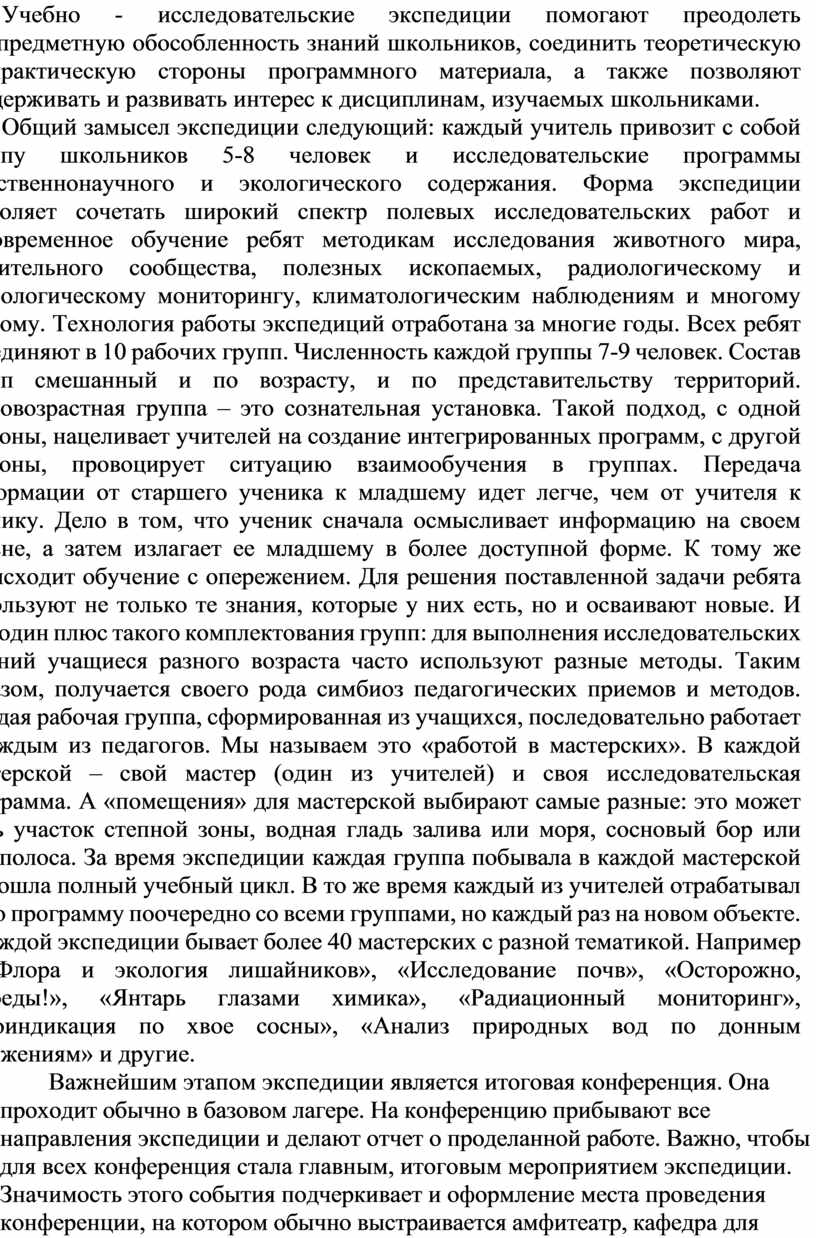 Проводимые ежегодно экологические экспедиции способствуют обновлению содержания экологического образования и вовлекают учащихся в увлекательный процесс исследования природы.