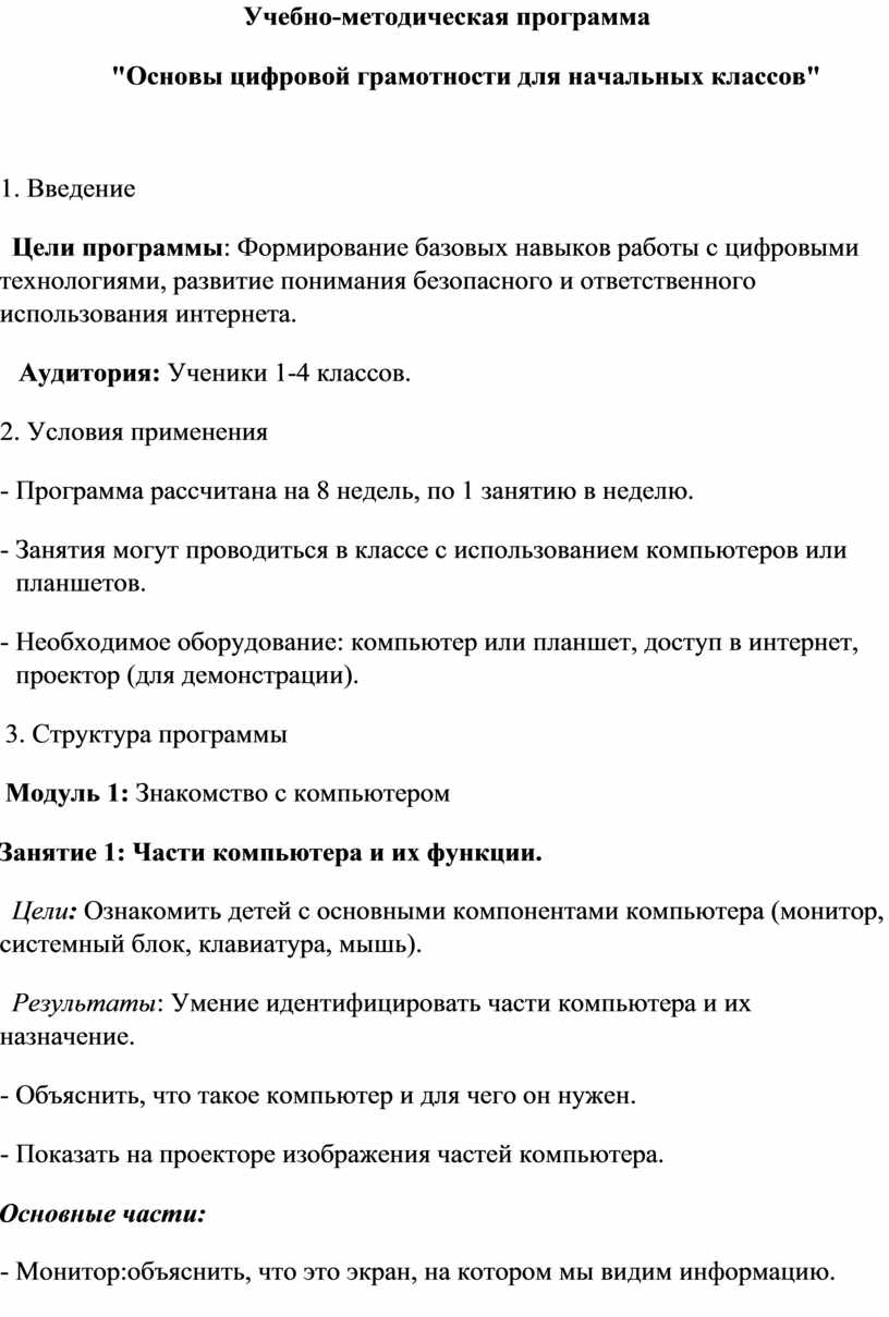 Цели программы: Формирование базовых навыков работы с цифровыми технологиями, развитие понимания безопасного и ответственного использования интернета.
