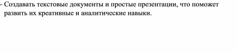 - Создавать текстовые документы и простые презентации, что поможет развить их креативные и аналитические навыки.