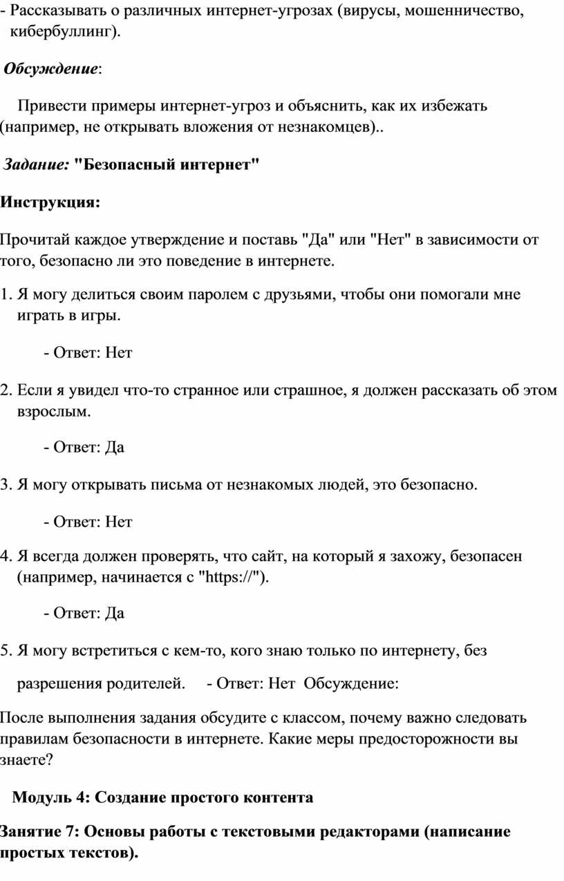 После выполнения задания обсудите с классом, почему важно следовать правилам безопасности в интернете. Какие меры предосторожности вы знаете?