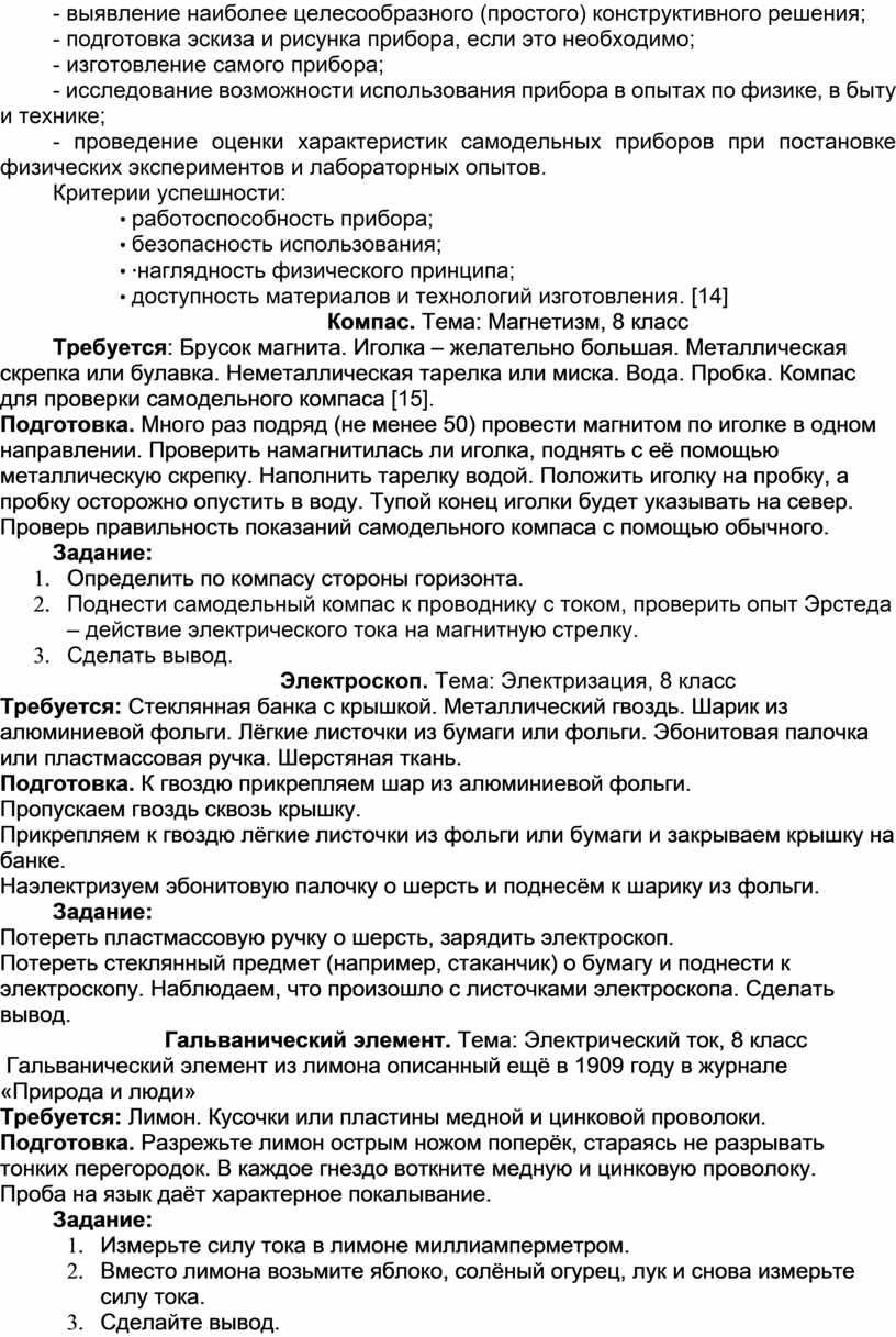 Изготовление приборов своими руками из подручных средств необходимо для развития творческих и практических умений у школьников. Важные этапы творческой деятельности связаны с переходом от фактов к построению абстрактной модели.