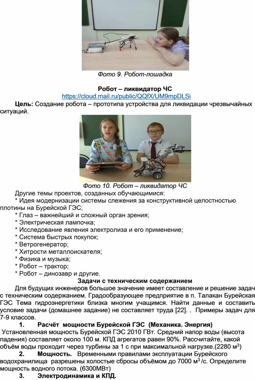 Для будущих инженеров большое значение имеет составление и решение задач с техническим содержанием. Градообразующее предприятие в п. Талакан Бурейская ГЭС Тема гидроэнергетики близка многим учащимся. Найти данные и составить условие задачи (домашнее задание) не составляет труда [22]. . Примеры задач для 7-9 классов.