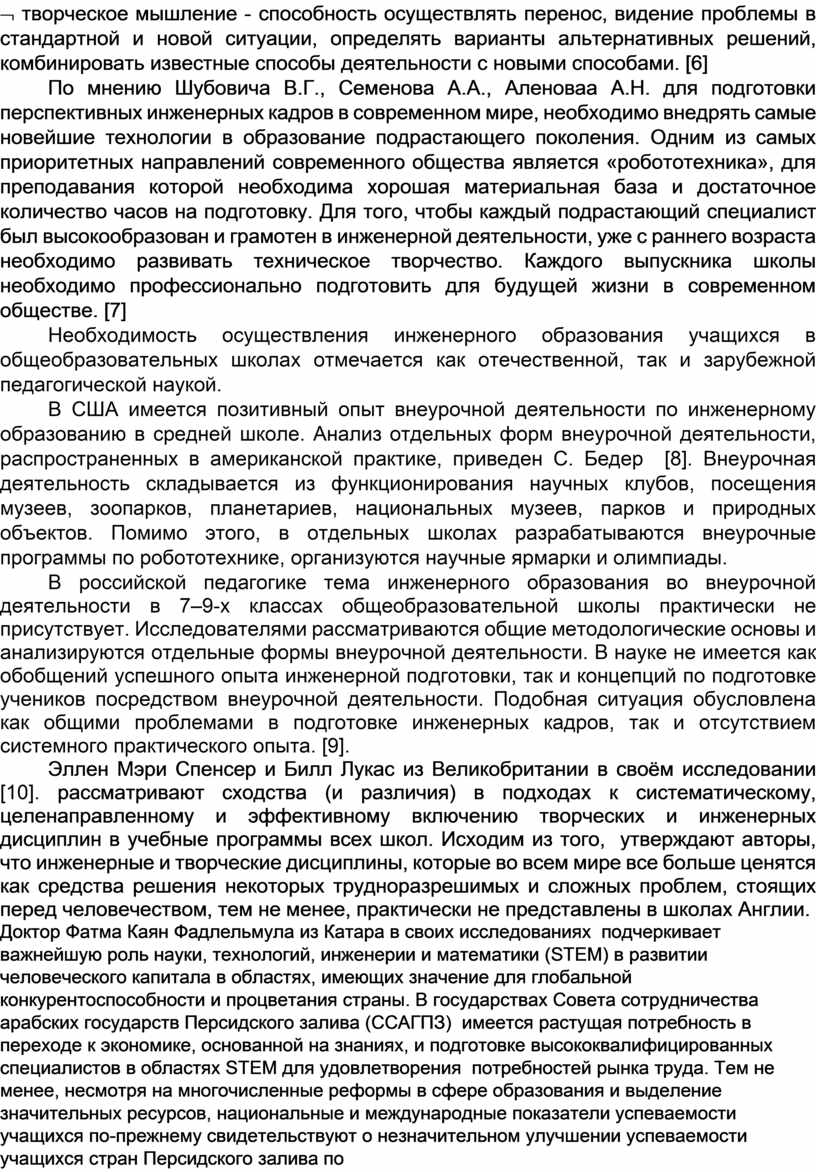По мнению Шубовича В.Г., Семенова А.А., Аленоваа А.Н. для подготовки перспективных инженерных кадров в современном мире, необходимо внедрять самые новейшие технологии в образование подрастающего поколения. Одним из самых приоритетных направлений современного общества является «робототехника», для преподавания которой необходима хорошая материальная база и достаточное количество часов на подготовку. Для того, чтобы каждый подрастающий специалист был высокообразован и грамотен в инженерной деятельности, уже с раннего возраста необходимо развивать техническое творчество. Каждого выпускника школы необходимо профессионально подготовить для будущей жизни в современном обществе. [7]