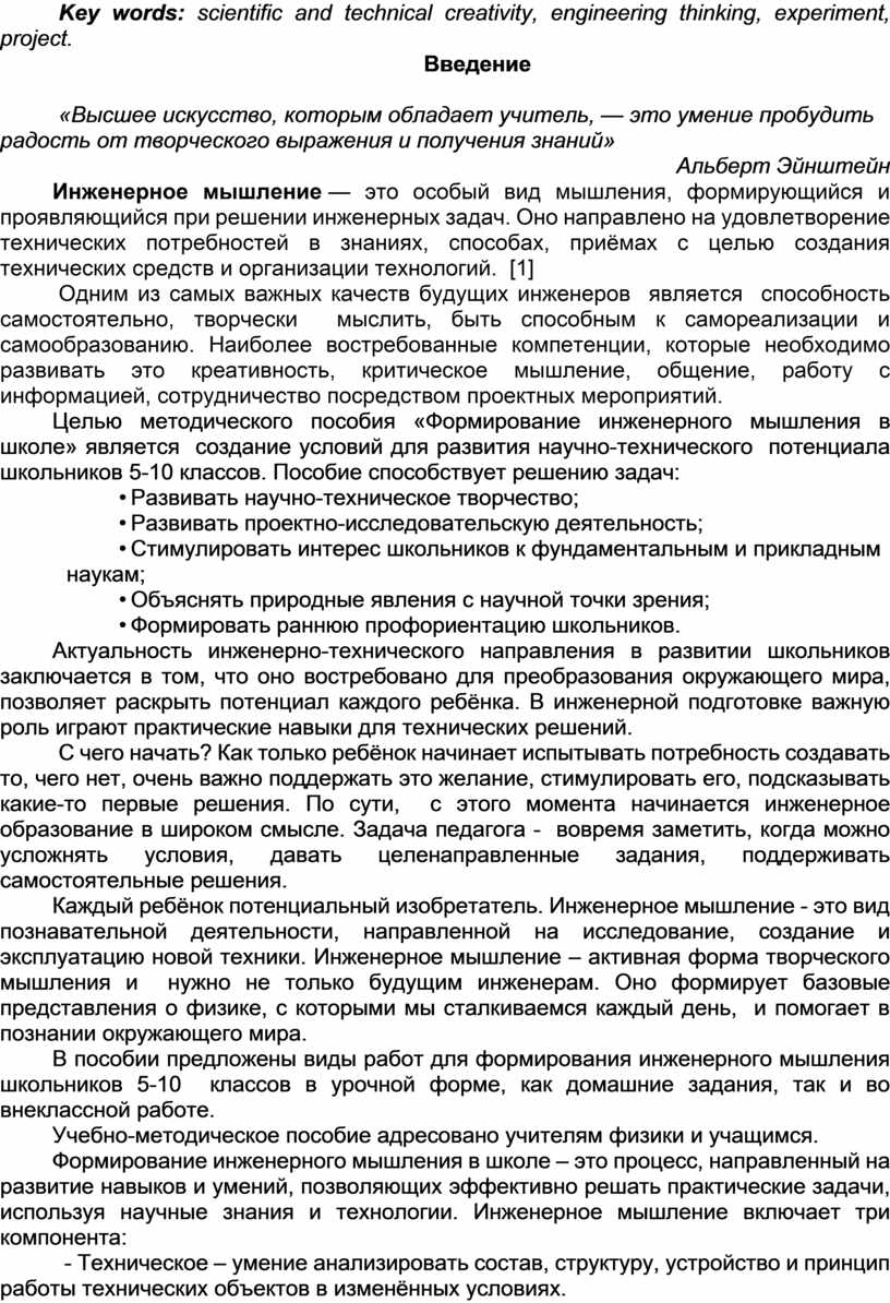 Ключевые слова: научно-техническое творчество, инженерное мышление, эксперимент, проект.