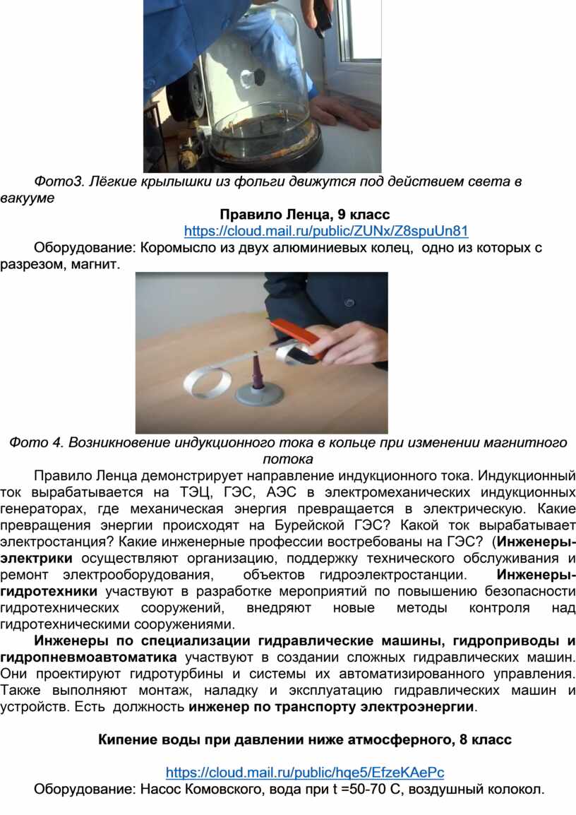 Правило Ленца демонстрирует направление индукционного тока. Индукционный ток вырабатывается на ТЭЦ, ГЭС, АЭС в электромеханических индукционных генераторах, где механическая энергия превращается в электрическую. Какие превращения энергии происходят на Бурейской ГЭС? Какой ток вырабатывает электростанция? Какие инженерные профессии востребованы на ГЭС? (Инженеры-электрики осуществляют организацию, поддержку технического обслуживания и ремонт электрооборудования, объектов гидроэлектростанции. Инженеры-гидротехники участвуют в разработке мероприятий по повышению безопасности гидротехнических сооружений, внедряют новые методы контроля над гидротехническими сооружениями.