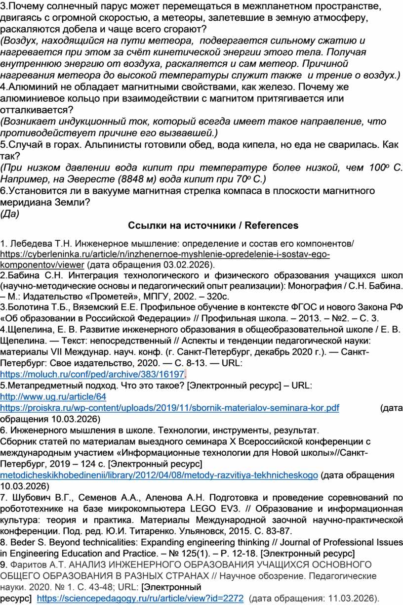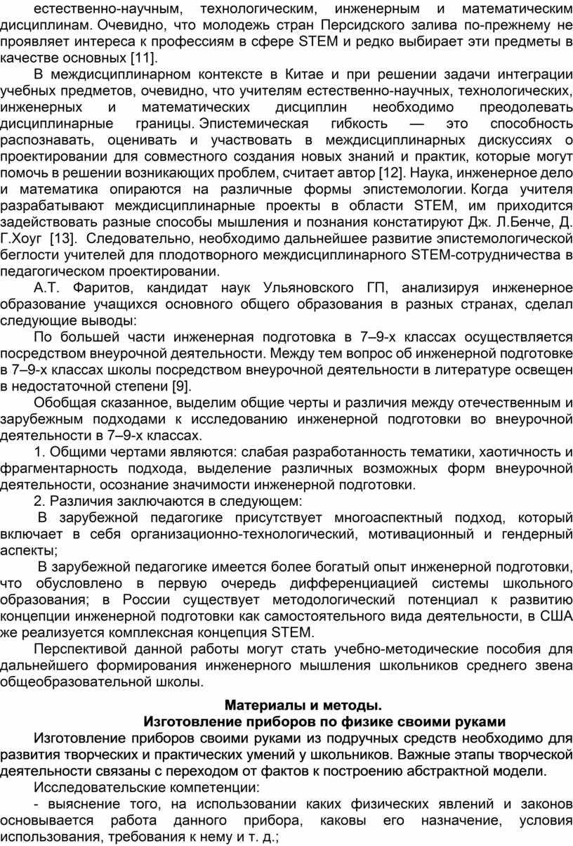 9. Фаритов А.Т. АНАЛИЗ ИНЖЕНЕРНОГО ОБРАЗОВАНИЯ УЧАЩИХСЯ ОСНОВНОГО ОБЩЕГО ОБРАЗОВАНИЯ В РАЗНЫХ СТРАНАХ // Научное обозрение. Педагогические науки. 2020. № 1. С. 43-48; URL: [Электронный ресурс] https://sciencepedagogy.ru/ru/article/view?id=2272 (дата обращения: 11.03.2026).