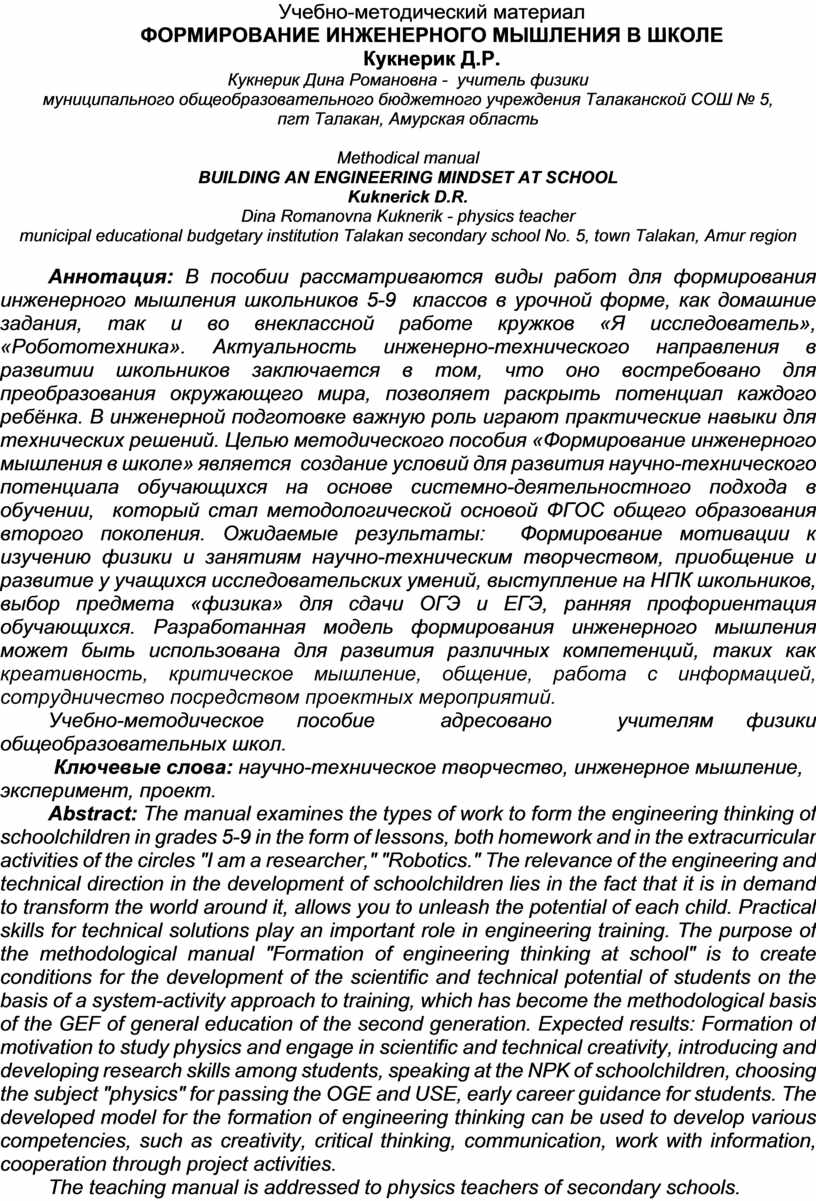 Abstract: The manual examines the types of work to form the engineering thinking of schoolchildren in grades 5-9 in the form of lessons, both homework and in the extracurricular activities of the circles "I am a researcher," "Robotics." The relevance of the engineering and technical direction in the development of schoolchildren lies in the fact that it is in demand to transform the world around it, allows you to unleash the potential of each child. Practical skills for technical solutions play an important role in engineering training. The purpose of the methodological manual "Formation of engineering thinking at school" is to create conditions for the development of the scientific and technical potential of students on the basis of a system-activity approach to training, which has become the methodological basis of the GEF of general education of the second generation. Expected results: Formation of motivation to study physics and engage in scientific and technical creativity, introducing and developing research skills among students, speaking at the NPK of schoolchildren, choosing the subject "physics" for passing the OGE and USE, early career guidance for students. The developed model for the formation of engineering thinking can be used to develop various competencies, such as creativity, critical thinking, communication, work with information, cooperation through project activities.