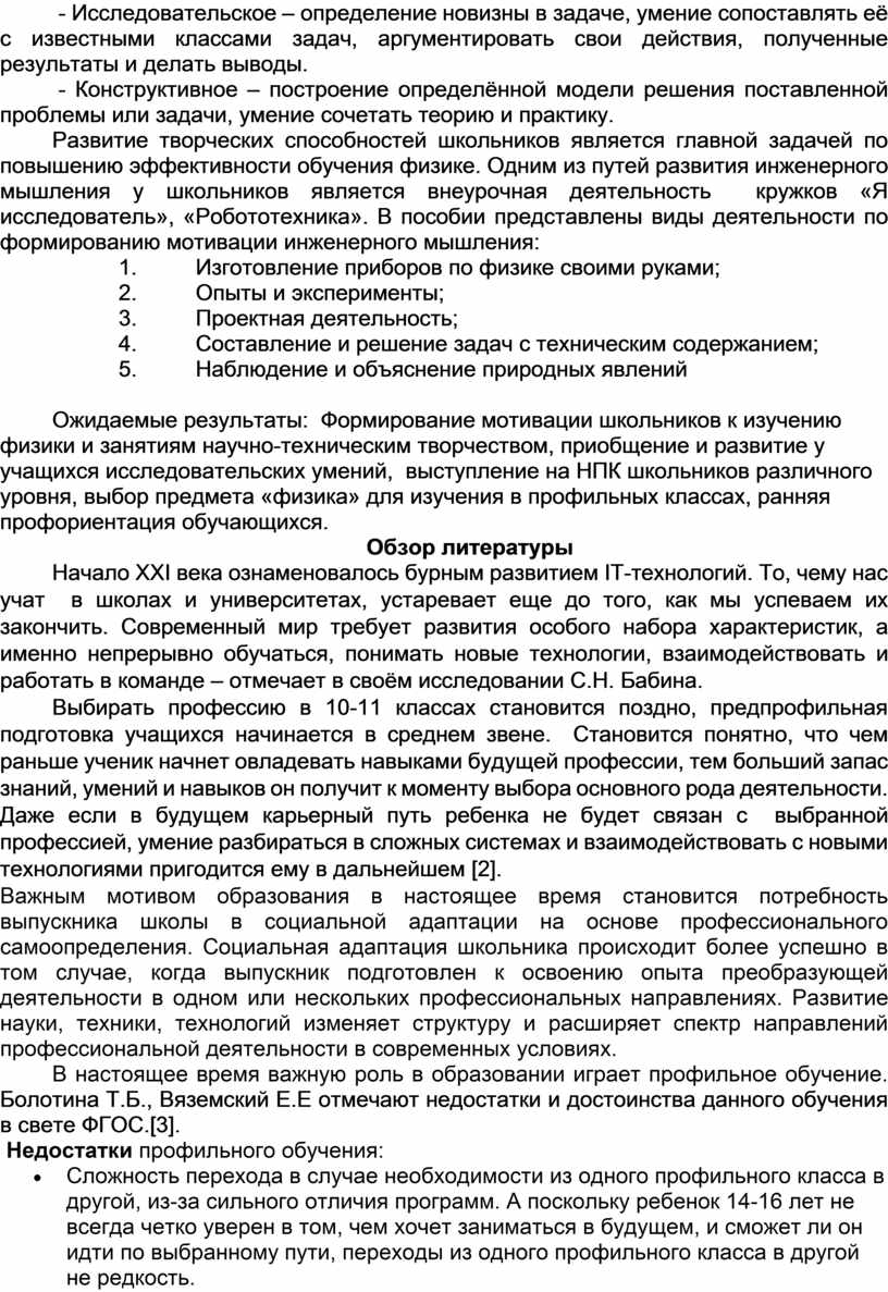 В настоящее время важную роль в образовании играет профильное обучение. Болотина Т.Б., Вяземский Е.Е отмечают недостатки и достоинства данного обучения в свете ФГОС.[3].