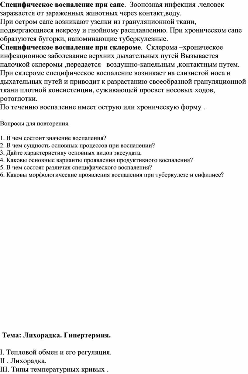 I.Развитие болезни.Болезненный процесс. В течении болезни наблюдаются следующие периоды: -скрытый или латентный; -продромальный; -период выраженных проявлений болезни или разгар болезни; -завершение болезни, ее исход. 1. Скрытый или латентный, а при инфекционных болезнях инкубационный период. Это время от начала воздействия болезнетворного агента до возникновения явлений, т.е. первых симптомов болезни (при скарлатине от 2 до 6 дней, бешенстве от 12 дней до1,5 лет, проказы - несколько лет). 2. Продромальный период - начинается с появлением первых признаков болезни, нечетных и еще не характерных (большая температура тела, болезненные боли, недомогание). 3. Период выраженных проявлений болезни - развивается вслед за продромальным, характерные признаки (корь продолжается 8-10 дней). Часть симптомов не проявляется – стертые симптомы. Абортивные симптомы - когда все проявления болезни исчезают быстрее, чем обычно. По продолжительности течение болезни делят на: - острые (грипп, чума) - подострые - хронические (туберкулез, сифилис). Для некоторых болезней характерны рецидивы - это возврат болезней после промежутка, кажущегося выздоровления. Течение болезни может протекать с осложнениями. Осложнения - неблагоприятный вариант течения основного заболевания, присоединения других болезней (воспаление легких - осложняющие многие инфекционные болезни). Осложнения нередко протекают тяжелее основного заболевания (ранение, осложняется гангреной). 4. Исход болезни. Болезнь чаще всего кончается полным выздоровлением, но может наступить неполное выздоровление или смерть. 1)Полное выздоровление - восстановление нормальной функции организма, исчезновение всех болезненных явлений. 2)Неполное выздоровление - когда нарушения функции вызванное болезнью исчезает не полностью (после коклюша - кашель), остаточные явления - стойкие изменения (рубцы после ожога, изменения клапанов сердца после ревматизма). 3)Затяжное течение и переход в хроническую форму. 4)Смерть. II.Понятие о смерти. Смерть - это необратимое прекращение функции организма.различают естественную и патологическую(по болезни,насильственную).Смерть может наступить очень быстро-мгновенная смерть,при которой невозможно проследить стадии умирания. По обратимости процесса: 1)клиническая; 2) биологическая.