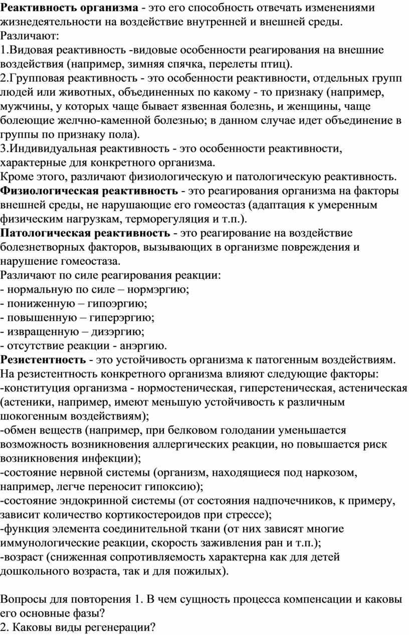 Реактивность-это свойство организма дифференцированно отвечать на воздействия окружающей или внутренней среды. Индивидуальная реактивность зависит от таких факторов, как наследственность, возраст, пол, факторы окружающей среды организма. Патологическая реактивность проявляется во время болезней,для нее характерно ослабление защитно-приспособительных реакций организма. В регуляции защитных функций главная роль принадлежит нервной системе. И. П. Павлов установил, что при различных патологических состояниях торможение высшей нервной деятельности играет важную защитную, охранительную роль, предупреждая повреждения нервных клеток.