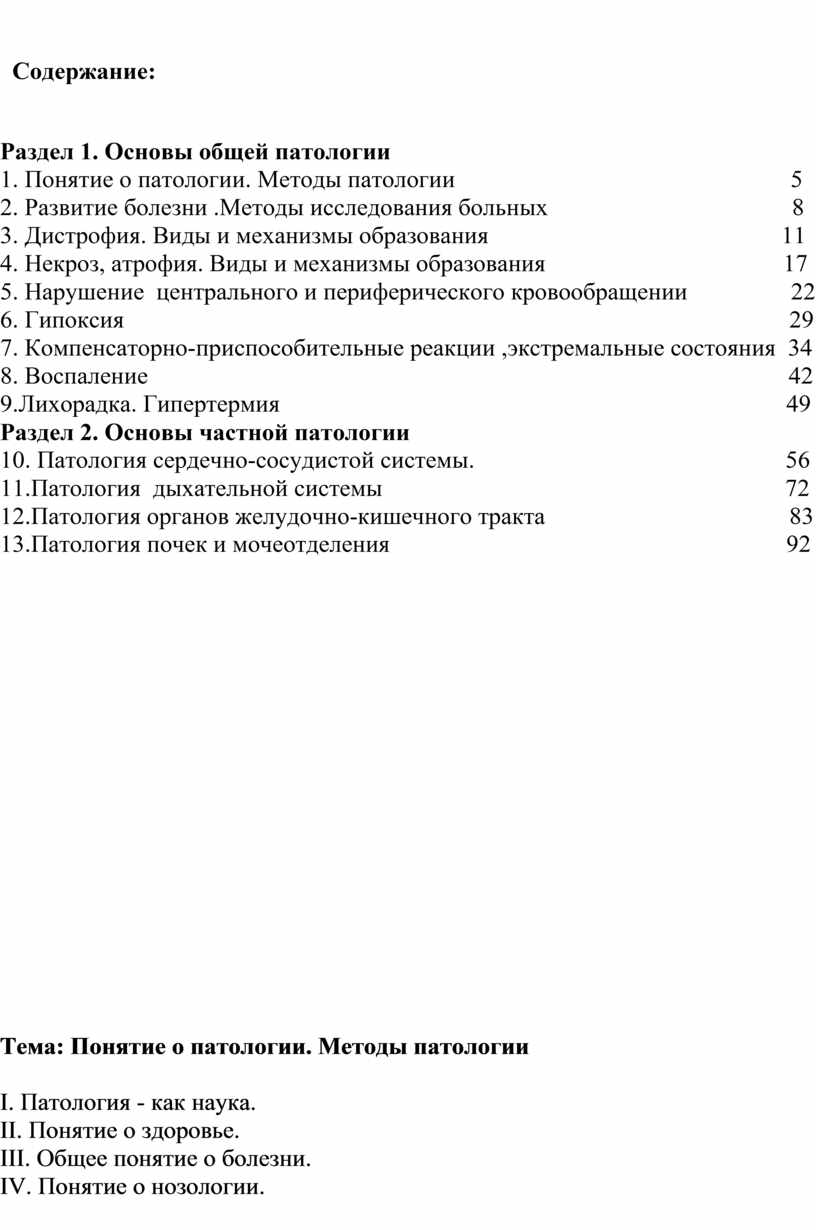 Раздел 1. Основы общей патологии 1. Понятие о патологии. Методы патологии 5 2. Развитие болезни .Методы исследования больных 8 3. Дистрофия. Виды и механизмы образования 11 4. Некроз, атрофия. Виды и механизмы образования 17 5. Нарушение центрального и периферического кровообращении 22 6. Гипоксия 29 7. Компенсаторно-приспособительные реакции ,экстремальные состояния 34 8. Воспаление 42 9.Лихорадка. Гипертермия 49 Раздел 2. Основы частной патологии 10. Патология сердечно-сосудистой системы. 56 11.Патология дыхательной системы 72 12.Патология органов желудочно-кишечного тракта 83 13.Патология почек и мочеотделения 92