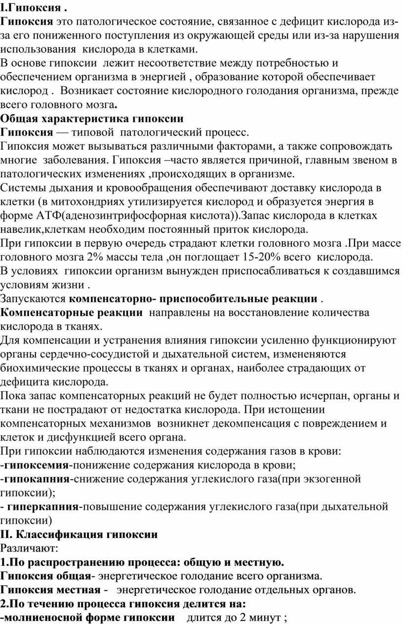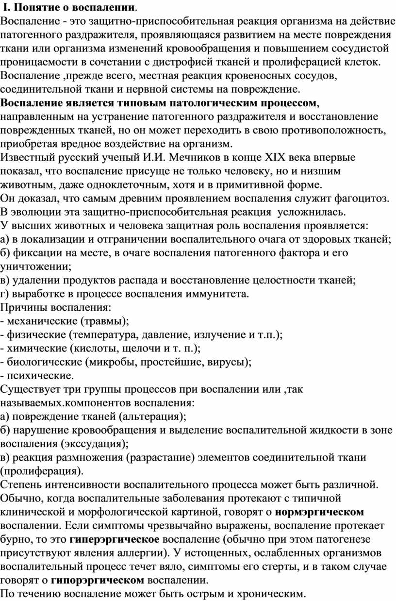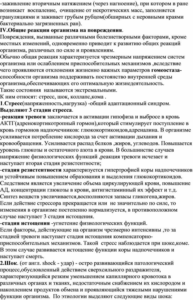 I.Повреждение Повреждением - или альтерацией называется изменение клеток, межклеточного вещества, а в зависимости от объема поврежденных клеток - тканей и органов. При повреждении меняется метаболизм(обмен веществ), что приводит к нарушению жизнедеятельности тканей и органов, и нарушается функция. Повреждением сопровождается любое заболевание или патологический процесс. Повреждение вызывает активацию защитных и приспособительных реакции. В случаях, когда защитно - приспособительные реакции достаточны для того, чтобы ликвидировать повреждение наступает выздоровление. В случаях, когда защитно - приспособительные реакции оказываются недостаточными, повреждения становятся необратимыми и развивается гибель тканей со снижением или полной потерей функции организма. Если тяжесть повреждения нарастает и не компенсируются приспособительными функциями организма, наступает смерть больного. Характер повреждения зависит от многих причин: -от особенности повреждающих воздействий –механических, химических или инфекционных факторов. -от механизма их действия на ткани - прямой или опосредованный (через кровь или нервную систему). –от различной чувствительности тканей к повреждающим факторам.