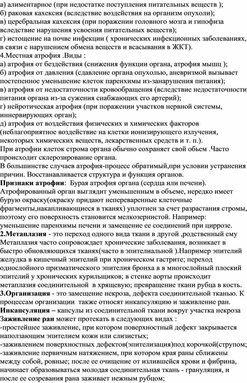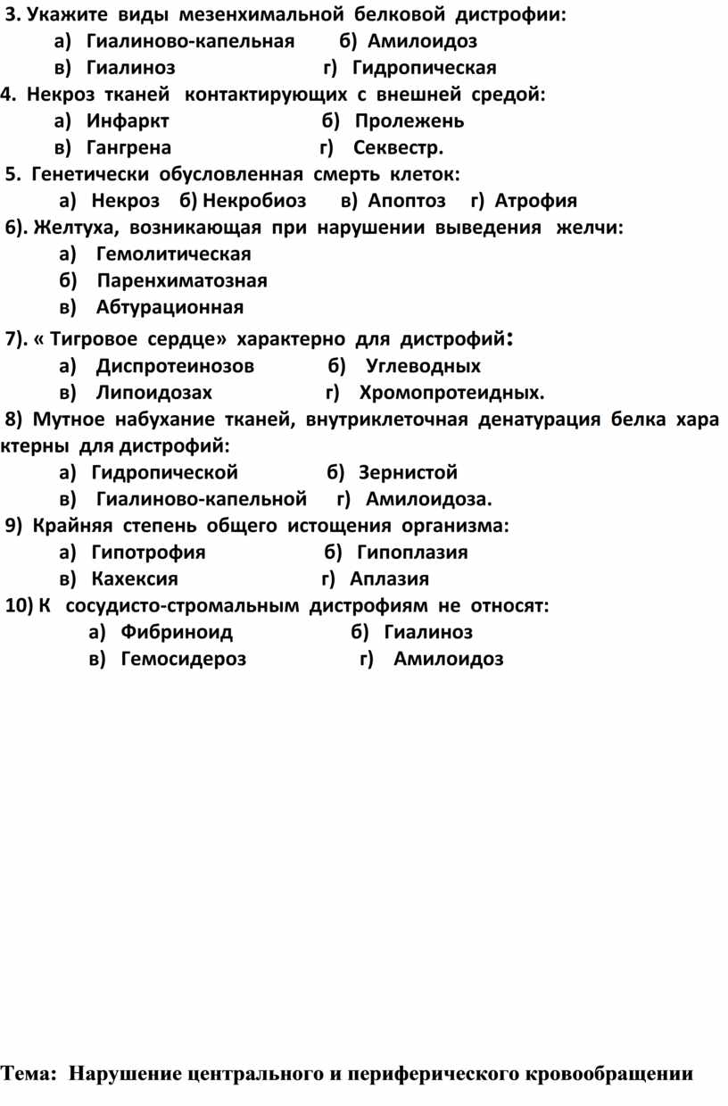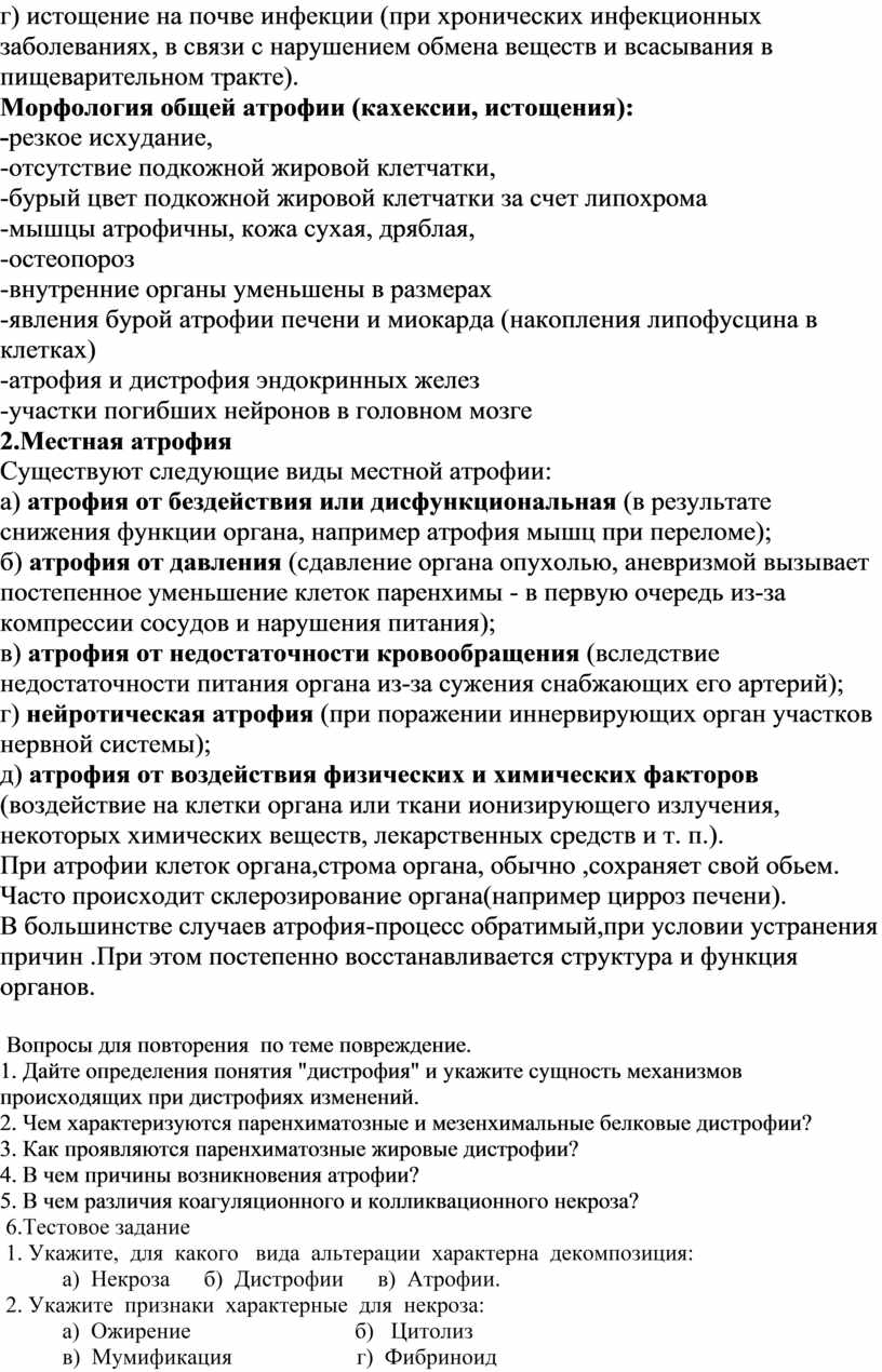 Вопросы для повторения по теме повреждение. 1. Дайте определения понятия "дистрофия" и укажите сущность механизмов происходящих при дистрофиях изменений. 2. Чем характеризуются паренхиматозные и мезенхимальные белковые дистрофии? 3. Как проявляются паренхиматозные жировые дистрофии? 4. В чем причины возникновения атрофии? 5. В чем различия коагуляционного и колликвационного некроза?