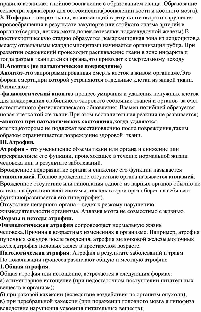 II.Апоптоз (не патологическое повреждение) Апоптоз-это запрограммированная смерть клеток в живом организме.Это форма смерти,при которой устраняются отдельные клетки из живой ткани. Различают : -физиологический апоптоз-процесс умирания и удаления ненужных клеток для поддержания стабильного здорового состояние тканей и органов за счет естественного физиологического обновления. Взамен погибшей образуется новая клетка той же ткани.При этом воспалительная реакция не развивается; -апоптоз при патологических состояниях,когда удаляются клетки,котороые не подлежат восстановлению после повреждения,таким образом ограничивается повреждение здоровой ткани. III.Атрофия. Атрофия - это уменьшение объема ткани или органа и снижение или прекращением его функции, происходящее в течение нормальной жизни человека или в результате заболеваний. Врожденное недоразвитие органа и снижение его функции называется гипоплазией. Полное врожденное отсутствие органа называется аплазией. Врожденное отсутствие или гипоплазия одного из парных органов обычно не влияет на функцию всей системы, так как второй орган берет на себя всю функцию(развивается его гипертрофия). Отсутствие непарного органа – ведет к резкому нарушению жизнедеятельности организма. Аплазия мозга не совместимо с жизнью. Формы и исходы атрофии. Физиологическая атрофия сопровождает нормальную жизнь человека.Причина в возрастных изменениях в организме. Например, атрофия пупочных сосудов после рождения, атрофия вилочковой железы,молочных желез,атрофия половых желез в престарелом возрасте. Патологическая атрофия. Атрофия в результате заболеваний и травм. По локализации процесса различают общую и местную атрофию 1.Общая атрофия. Общая атрофия или истощение, встречается в следующих формах: а) алиментарное истощение (при недостаточном поступлении питательных веществ в организм); б) при раковой кахексии (вследствие воздействия на организм опухоли); в) при церебральной кахексии (при поражении головного мозга и гипофиза вследствие нарушения усвоения питательных веществ); г) истощение на почве инфекции (при хронических инфекционных заболеваниях, в связи с нарушением обмена веществ и всасывания в пищеварительном тракте). Морфология общей атрофии (кахексии, истощения): -резкое исхудание, -отсутствие подкожной жировой клетчатки, -бурый цвет подкожной жировой клетчатки за счет липохрома -мышцы атрофичны, кожа сухая, дряблая, -остеопороз -внутренние органы уменьшены в размерах -явления бурой атрофии печени и миокарда (накопления липофусцина в клетках) -атрофия и дистрофия эндокринных желез -участки погибших нейронов в головном мозге