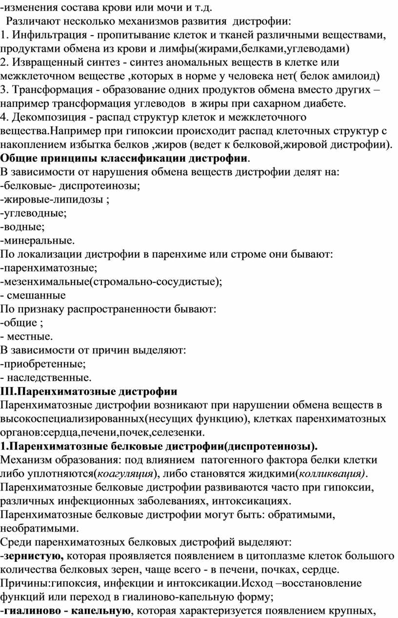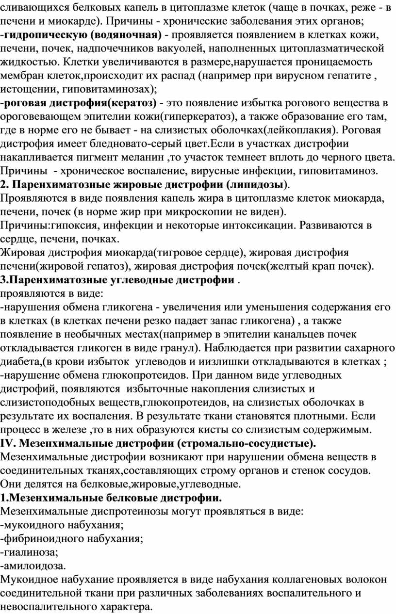 I. Повреждение. II. Дистрофия.Классификация. III.Паренхиматозные дистрофии . IV. Мезенхимальные дистрофии.