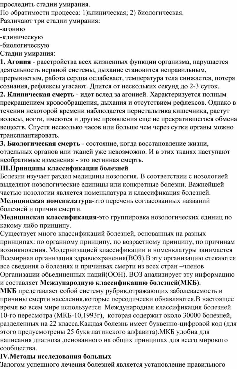 Различают три стадии умирания: -агонию -клиническую -биологическую Стадии умирания: 1. Агония - расстройства всех жизненных функции организма, нарушается деятельность нервной системы, дыхание становится неправильным, прерывистым, работа сердца ослабевает, температура тела снижается, потеря сознания, рефлексы угасают. Длится от нескольких секунд до 2-3 суток. 2. Клиническая смерть - идет вслед за агонией. Характеризуется полным прекращением кровообращения, дыхания и отсутствием рефлексов. Однако в течении некоторой времени наблюдается перистальтика кишечника, растут волосы, ногти, имеются и другие проявления еще не прекратившегося обмена веществ. Спустя несколько часов или больше чем через сутки органы можно трансплантировать. 3. Биологическая смерть - состояние, когда восстановление жизни, отдельных органов или тканей уже невозможно. И в этих тканях наступают необратимые изменения - это истинная смерть. III.Принципы классификации болезней
