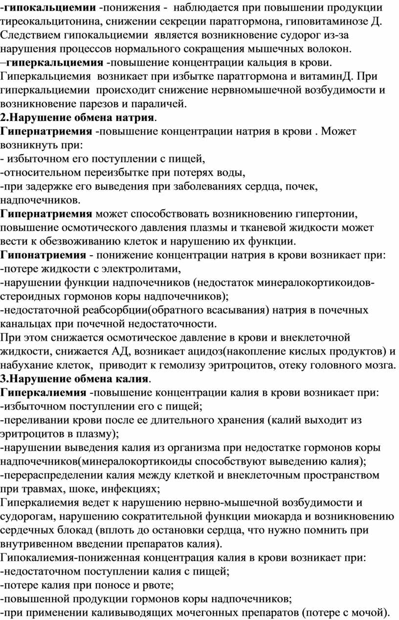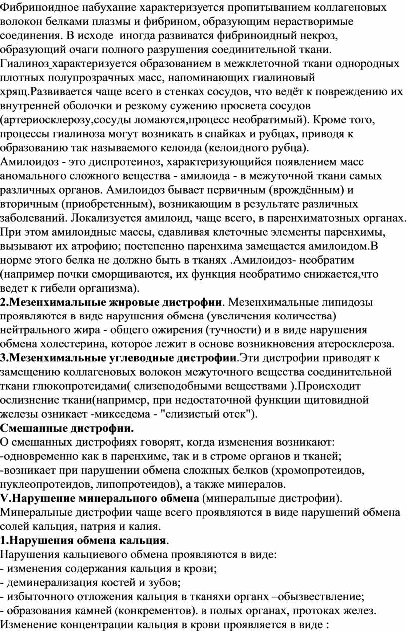 IV. Мезенхимальные дистрофии (стромально-сосудистые). Мезенхимальные дистрофии возникают при нарушении обмена веществ в соединительных тканях,составляющих строму органов и стенок сосудов. Они делятся на белковые,жировые,углеводные. 1.Мезенхимальные белковые дистрофии. Мезенхимальные диспротеинозы могут проявляться в виде: -мукоидного набухания; -фибриноидного набухания; -гиалиноза; -амилоидоза. Мукоидное набухание проявляется в виде набухания коллагеновых волокон соединительной ткани при различных заболеваниях воспалительного и невоспалительного характера. Фибриноидное набухание характеризуется пропитыванием коллагеновых волокон белками плазмы и фибрином, образующим нерастворимые соединения. В исходе иногда развиватся фибриноидный некроз, образующий очаги полного разрушения соединительной ткани. Гиалиноз характеризуется образованием в межклеточной ткани однородных плотных полупрозрачных масс, напоминающих гиалиновый хрящ.Развивается чаще всего в стенках сосудов, что ведёт к повреждению их внутренней оболочки и резкому сужению просвета сосудов (артериосклерозу,сосуды ломаются,процесс необратимый). Кроме того, процессы гиалиноза могут возникать в спайках и рубцах, приводя к образованию так называемого келоида (келоидного рубца). Амилоидоз - это диспротеиноз, характеризующийся появлением масс аномального сложного вещества - амилоида - в межуточной ткани самых различных органов. Амилоидоз бывает первичным (врождённым) и вторичным (приобретенным), возникающим в результате различных заболеваний. Локализуется амилоид, чаще всего, в паренхиматозных органах. При этом амилоидные массы, сдавливая клеточные элементы паренхимы, вызывают их атрофию; постепенно паренхима замещается амилоидом.В норме этого белка не должно быть в тканях .Амилоидоз- необратим (например почки сморщиваются, их функция необратимо снижается,что ведет к гибели организма). 2.Мезенхимальные жировые дистрофии. Мезенхимальные липидозы проявляются в виде нарушения обмена (увеличения количества) нейтрального жира - общего ожирения (тучности) и в виде нарушения обмена холестерина, которое лежит в основе возникновения атеросклероза. 3.Мезенхимальные углеводные дистрофии.Эти дистрофии приводят к замещению коллагеновых волокон межуточного вещества соединительной ткани глюкопротеидами( слизеподобными веществами ).Происходит ослизнение ткани(например, при недостаточной функции щитовидной железы озникает -микседема - "слизистый отек"). Смешанные дистрофии. О смешанных дистрофиях говорят, когда изменения возникают: -одновременно как в паренхиме, так и в строме органов и тканей; -возникает при нарушении обмена сложных белков (хромопротеидов, нуклеопротеидов, липопротеидов), а также минералов. V.Нарушение минерального обмена (минеральные дистрофии). Минеральные дистрофии чаще всего проявляются в виде нарушений обмена солей кальция, натрия и калия. 1.Нарушения обмена кальция. Нарушения кальциевого обмена проявляются в виде: - изменения содержания кальция в крови; - деминерализация костей и зубов; - избыточного отложения кальция в тканяхи органх –обызвествление; - образования камней (конкрементов). в полых органах, протоках желез. Изменение концентрации кальция в крови проявляется в виде : -гипокальциемии -понижения - наблюдается при повышении пр