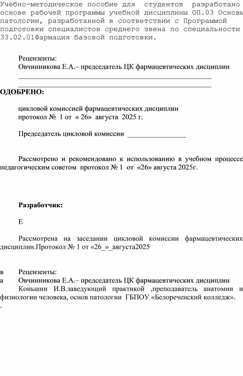 Учебно-методическое пособие для студентов разработано на основе рабочей программы учебной дисциплины ОП.03 Основы патологии, разработанной в соответствии с Программой подготовки специалистов среднего звена по специальности 33.02.01Фармация базовой подготовки.
