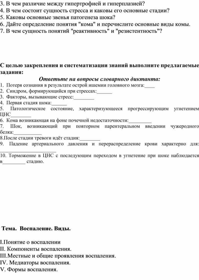 1. Дайте определение понятиям "здоровье" и "болезнь". 2. В чём состоит отличие пат. процесса от болезни? 3. В чём сущность понятия "патологическое состояние"? 4. Назовите условия, способствующие и препятствующие возникновению болезни? 5. Дайте определение понятий "этиология" и "патогенез". 6. В чём разница между причинами и условиями возникновения болезней? 7. Каковы принципы классификации болезней? 8. Каковы основные этапы развития болезни? Какими бывают исходы болезней? 9. Что такое смерть? Каковы этапы умирания?
