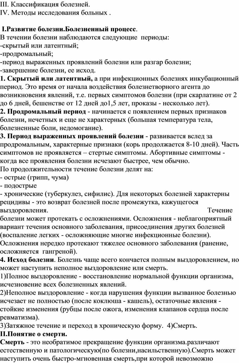 I. Развитие болезни.Стадии,исходы . II. Понятие о смерти. III. Классификация болезней. IV. Методы исследования больных .