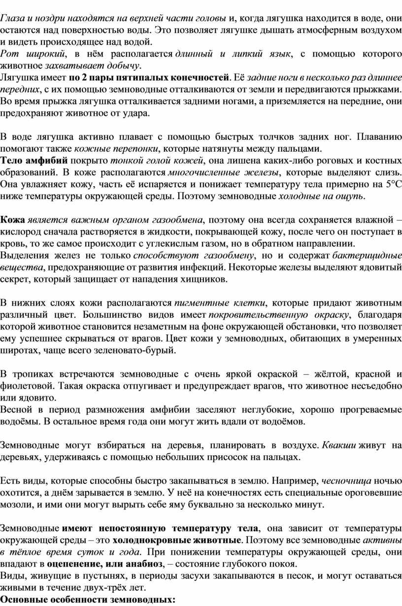 Земноводные имеют непостоянную температуру тела, она зависит от температуры окружающей среды – это холоднокровные животные. Поэтому все земноводные активны в тёплое время суток и года. При понижении температуры окружающей среды, они впадают в оцепенение, или анабиоз, – состояние глубокого покоя.
