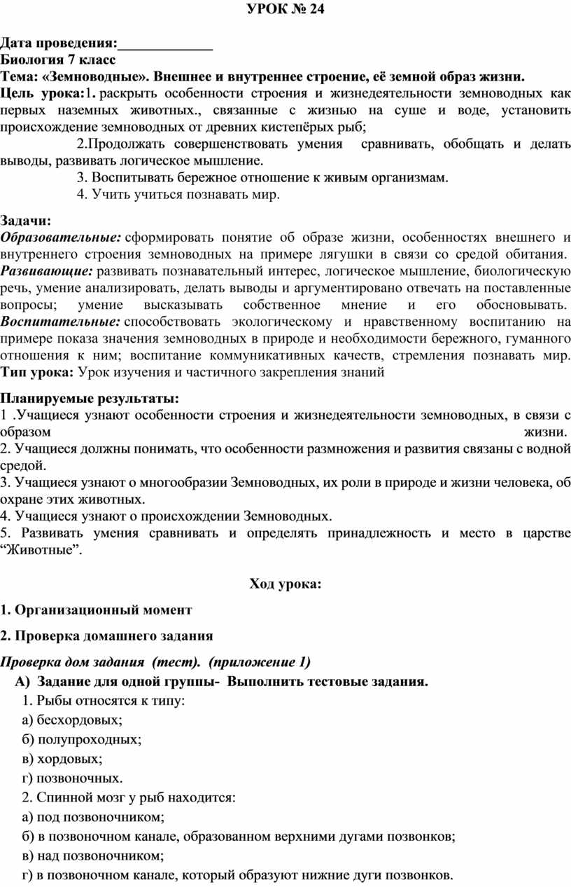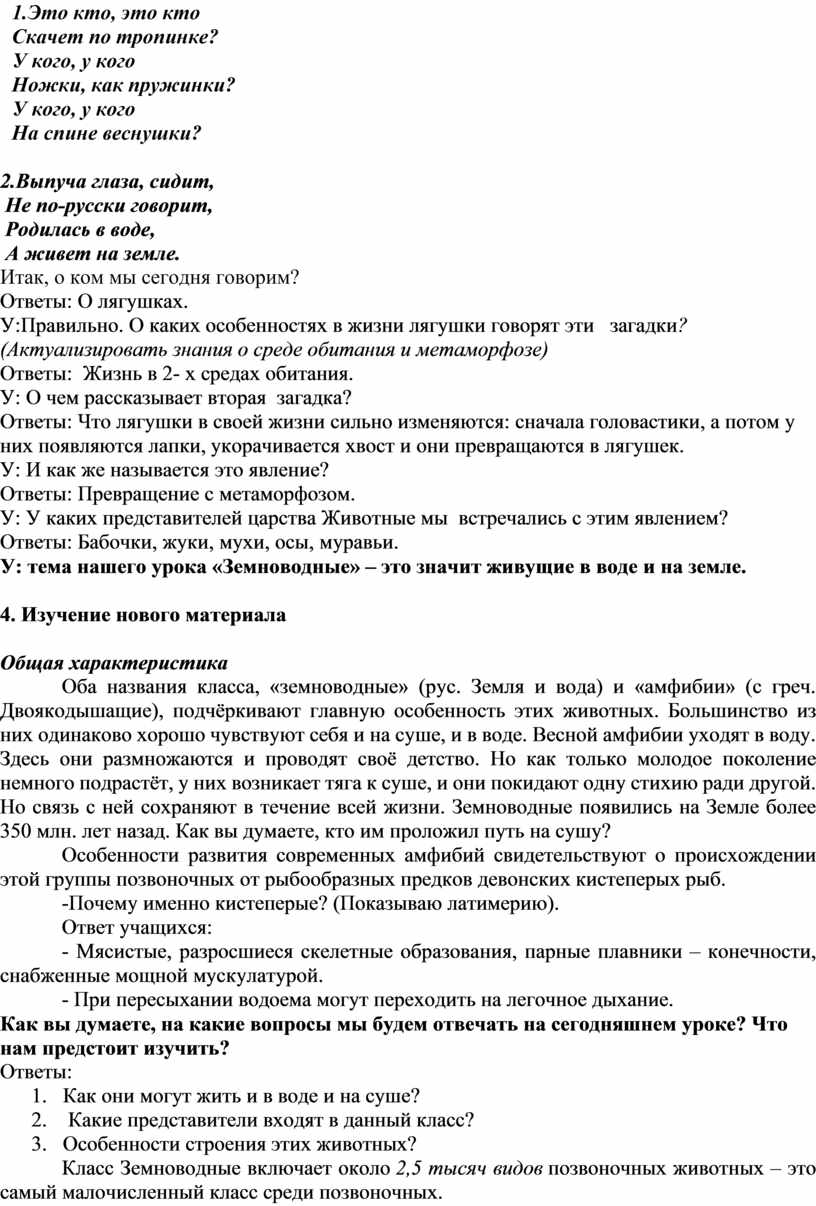 Цель урока:1. раскрыть особенности строения и жизнедеятельности земноводных как первых наземных животных., связанные с жизнью на суше и воде, установить происхождение земноводных от древних кистепёрых рыб;