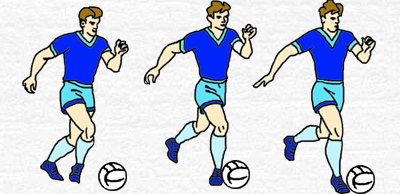 Это основной прием ведения, который представляет собой сочетание бега (реже ходьбы) и ударов по мячу ногой различными способами. Так как детали техники бега и ударов по мячу ногой различными способами были рассмотрены выше, подробно остановимся на особенностях ведения мяча.