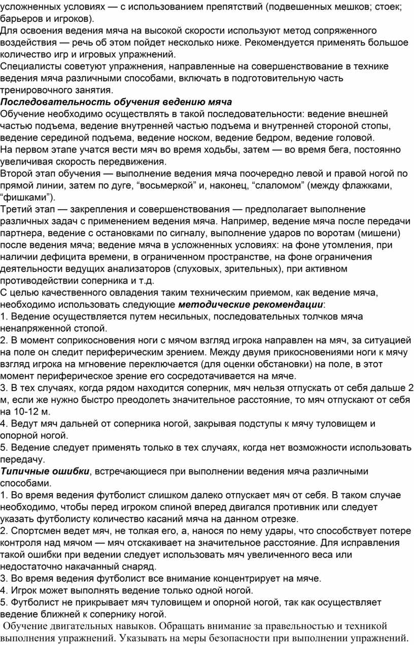 Обучение необходимо осуществлять в такой последовательности: ведение внешней частью подъема, ведение внутренней частью подъема и внутренней стороной стопы, ведение серединой подъема, ведение носком, ведение бедром, ведение головой.
