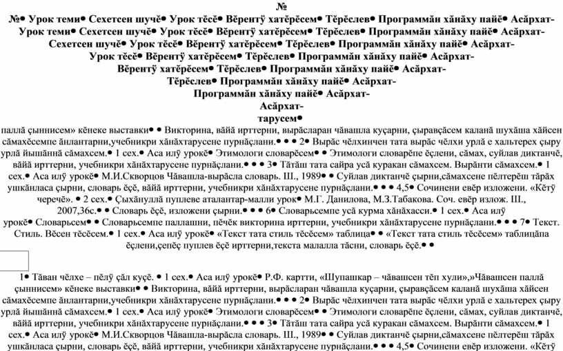 «Текст тата стиль тĕсĕсем» таблицăпа ĕçлени,çепĕç пуплев ĕçĕ ирттерни,текста малалла тăсни, словарь ĕçĕ. |