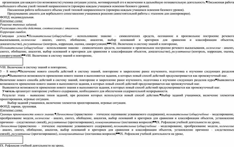 Формулирование двух целей (узнать, научиться). Составление плана по вопросам учителя, восстановление деформированного плана и т.п. Использование различных видов диалога (подводящий, побуждающий, мозговой штурм и т.п.). ФОПД: фронтальная, групповая. Ключевые слова: Какое знание строю, чему я учусь (цель)? Как я строю новое знание и с помощью чего (выбор способа и средств)? План построения нового знания. |