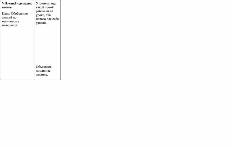 VIIэтап:Подведение итогов. Цель: Обобщение знаний по изученному материалу. |