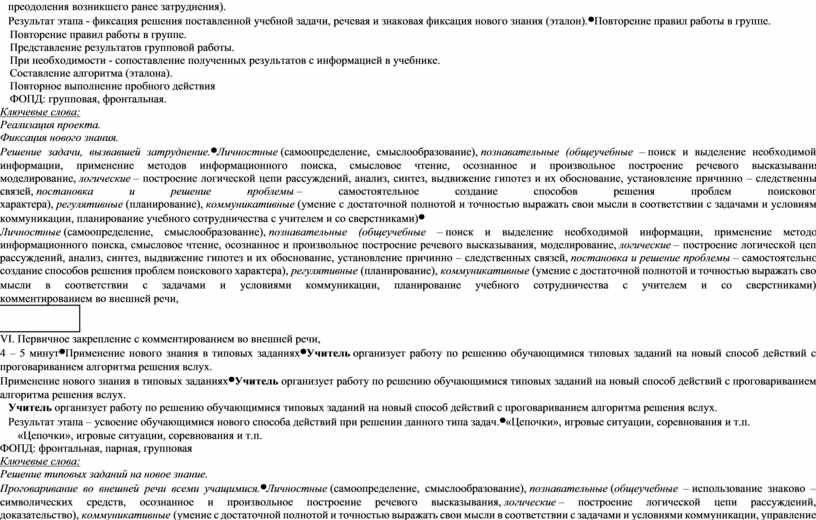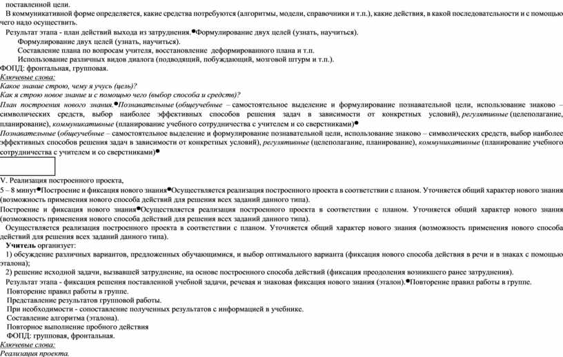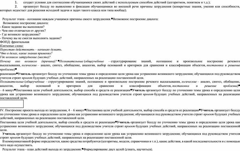 1. Самостоятельный выбор обучающимися метода решения проблемы 2. Самостоятельное решение обучающимися проблемы 3. Выполнение учителем роли организатора коммуникации 4. Четкое фиксирование нового способа действий (устно и в виде эталона) 5. Решение задания, вызвавшего затруднение при выполнении пробного действия |