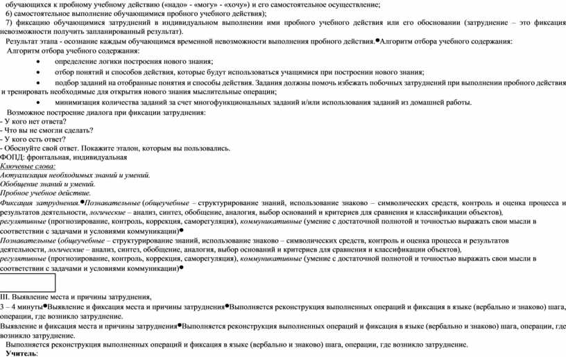 Выполняется реконструкция выполненных операций и фиксация в языке (вербально и знаково) шага, операции, где возникло затруднение. Учитель: 1. создает условия для соотнесения обучающимися своих действий с используемым способом действий (алгоритмом, понятием и т.д.); 2. организует беседу по выявлению и фиксации обучающимися во внешней речи причины затруднения (конкретные знания, умения или способности, которых недостает для решения исходной задачи и задач такого класса или типа вообще). Результат этапа - осознание каждым учащимся причины своего затруднения. |