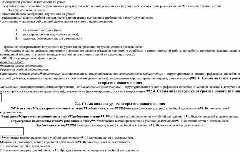1. Овладение учителем технологией деятельностного метода обучения (знание типологии уроков в ТДМ, структуры уроков, приемов и способов организации учебной деятельности), профессиональное самосовершенствование. Важным является умение учителя структурировать содержание урока: на каком материале будет организована проектная деятельность, какие понятия для этого необходимо ввести, какие выводы можно будет извлечь из полученного знания и т.п.