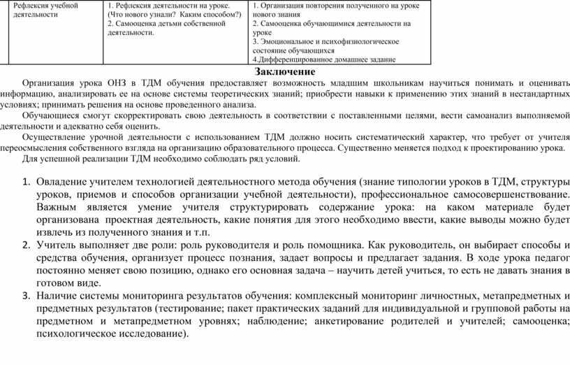 Организация урока ОНЗ в ТДМ обучения предоставляет возможность младшим школьникам научиться понимать и оценивать информацию, анализировать ее на основе системы теоретических знаний; приобрести навыки к применению этих знаний в нестандартных условиях; принимать решения на основе проведенного анализа.