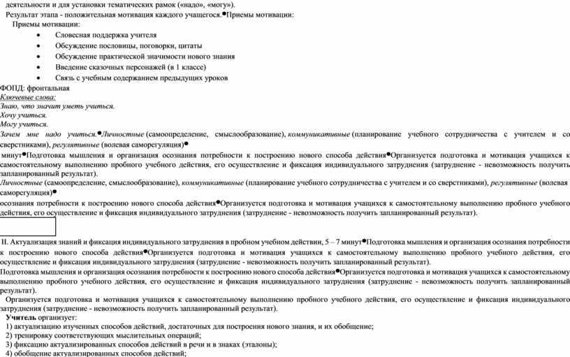 Организуется подготовка и мотивация учащихся к самостоятельному выполнению пробного учебного действия, его осуществление и фиксация индивидуального затруднения (затруднение - невозможность получить запланированный результат). Учитель организует: 1) актуализацию изученных способов действий, достаточных для построения нового знания, и их обобщение; 2) тренировку соответствующих мыслительных операций; 3) фиксацию актуализированных способов действий в речи и в знаках (эталоны); 4) обобщение актуализированных способов действий; 5) мотивирование обучающихся к пробному учебному действию («надо» - «могу» - «хочу») и его самостоятельное осуществление; 6) самостоятельное выполнение обучающимися пробного учебного действия); 7) фиксацию обучающимися затруднений в индивидуальном выполнении ими пробного учебного действия или его обосновании (затруднение – это фиксация невозможности получить запланированный результат). Результат этапа - осознание каждым обучающимся временной невозможности выполнения пробного действия. |