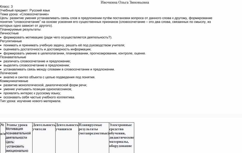 “словосочетание” на основе усвоения его существенных признаков (словосочетание