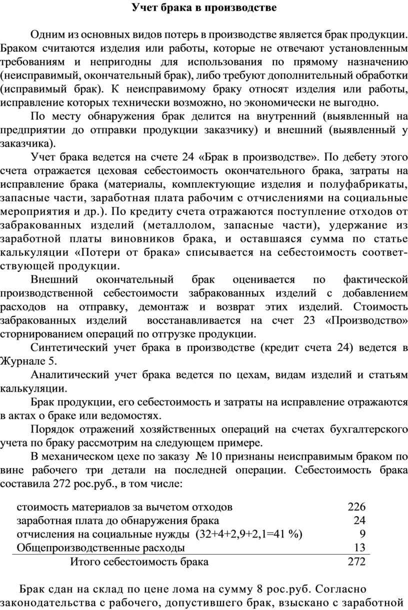 Учет брака ведется на счете 24 «Брак в производстве». По дебету этого счета отражается цеховая себестоимость окончательного брака, затраты на исправление брака (материалы, комплектующие изделия и полуфабрикаты, запасные части, заработная плата рабочим с отчислениями на социальные мероприятия и др.). По кредиту счета отражаются поступление отходов от забракованных изделий (металлолом, запасные части), удержание из заработной платы виновников брака, и оставшаяся сумма по статье калькуляции «Потери от брака» списывается на себестоимость соответ-ствующей продукции.