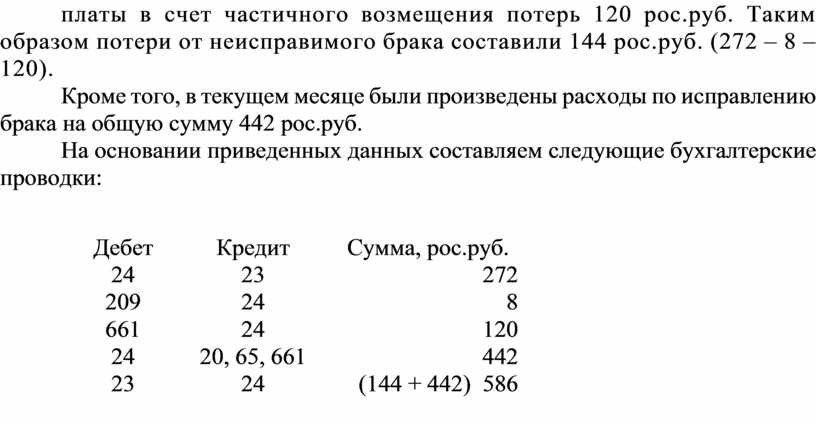 Брак сдан на склад по цене лома на сумму 8 рос.руб. Согласно законодательства с рабочего, допустившего брак, взыскано с заработной платы в счет частичного возмещения потерь 120 рос.руб. Таким образом потери от неисправимого брака составили 144 рос.руб. (272 – 8 – 120).
